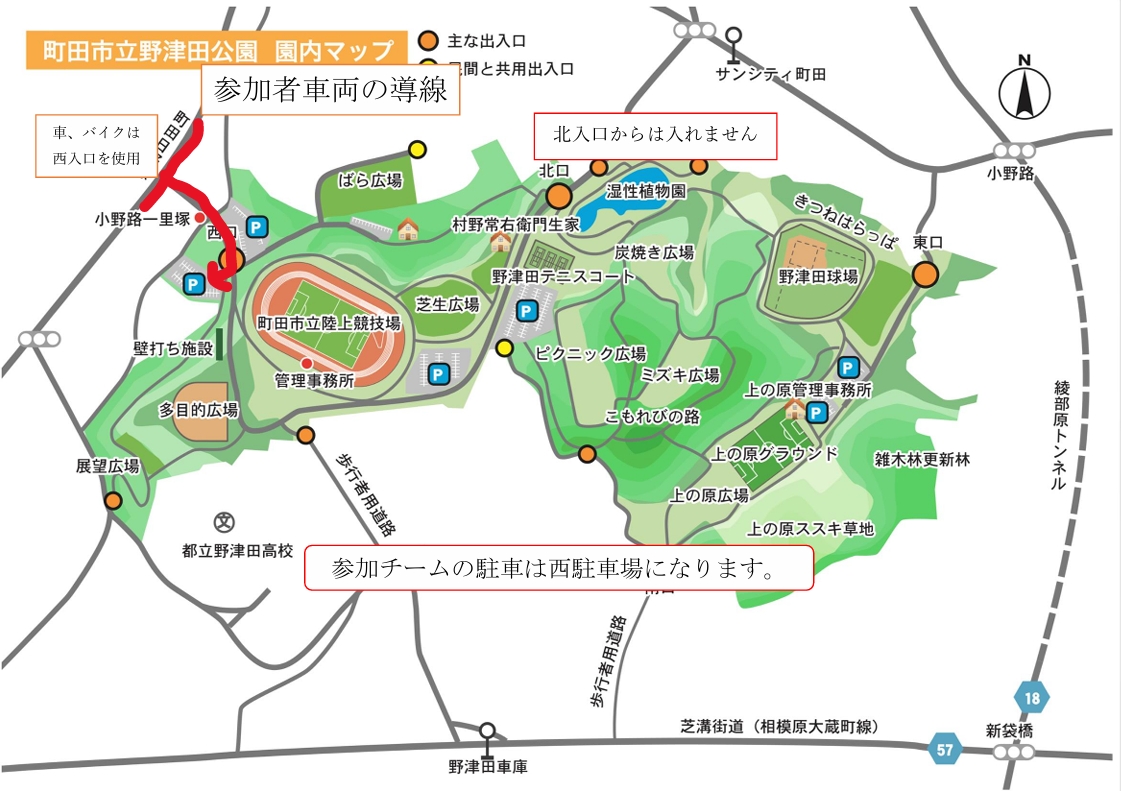 大会要項 一般シニア高校コース図 中学コース図 車は西口駐車場のみ可 |